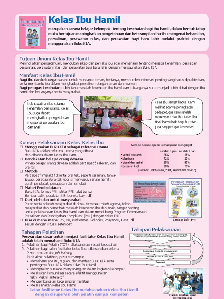 Kelas Ibu Hamil adalah sarana untuk belajar tentang kesehatan bagi ibu hamil dalam bentuk tatap muka dalam kelompok yang bertujuan untuk meningkatkan pengetahuan dan keterampilan ibu-ibu mengenai kehamilan. Petugas kesehatan dalam pelayanan kesehatan ibu dan anak. Kelas ibu hamil merupakan sarana untuk belajar bersama tentang kesehatan bagi ibu hamil dalam bentuk tatap muka dalam kelompok yang bertujuan untuk meningkatkan pengetahuan dan keterampilan ibu-ibu mengenai kehamilan perawatan kehamilan persalinan perawatan nifas perawatan bayi baru lahir Depkes 2009.